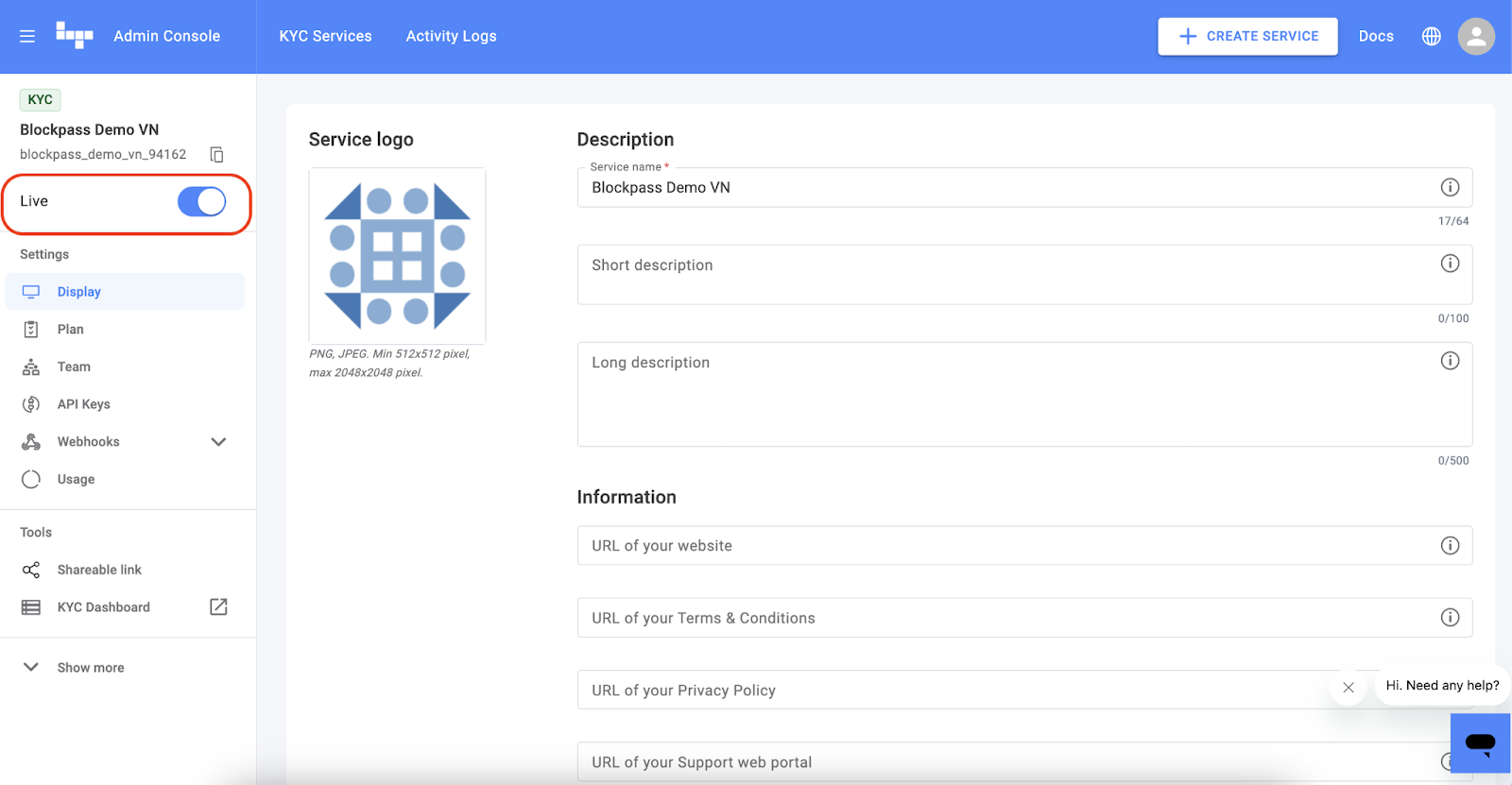 Access Settings: Log in to the Blockpass Console. Click the dropdown menu in the top right corner and select Company Info.