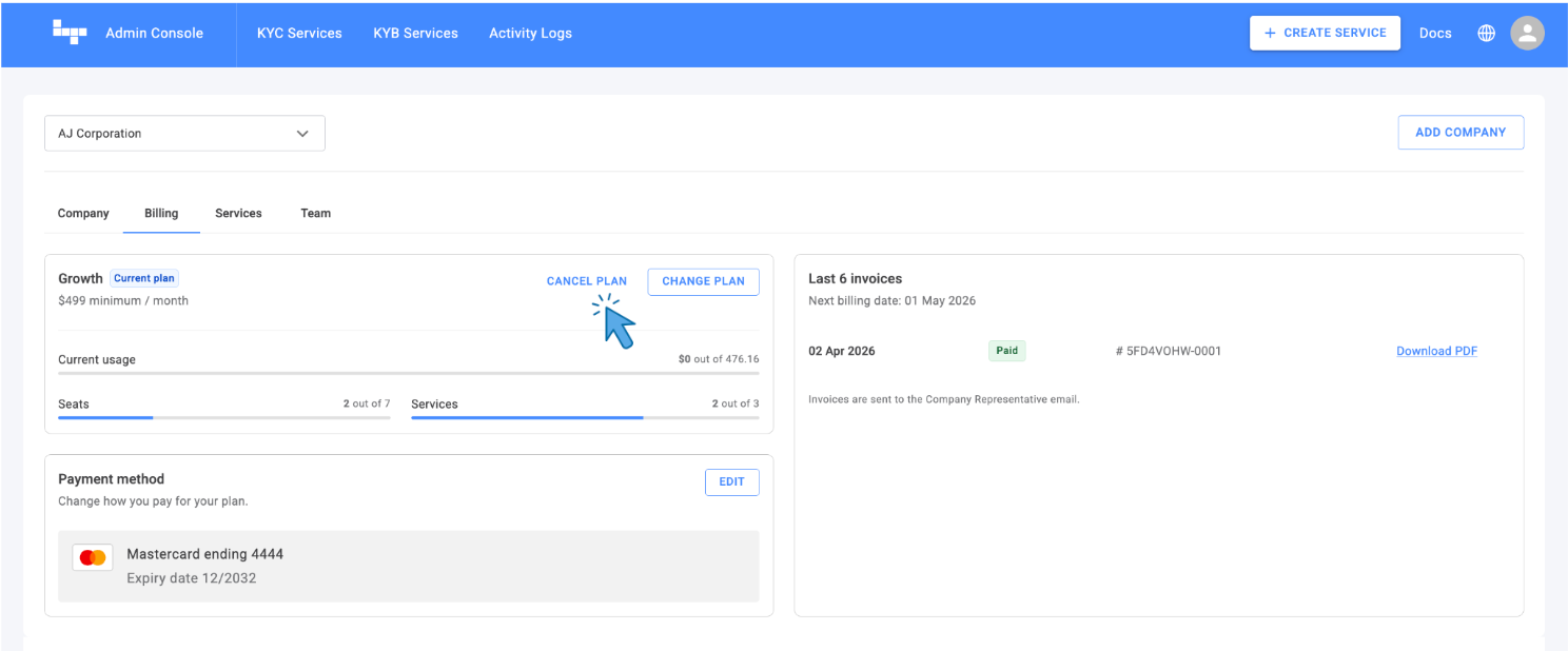 - Export Your Data: Before initiating cancellation, ensure you have exported all KYC/KYB data and reports from your active services.