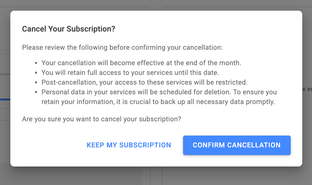 Personal data within your services will be scheduled for deletion once a cancellation or termination is processed. To ensure you retain your information, it is crucial to export all necessary data promptly before proceeding.