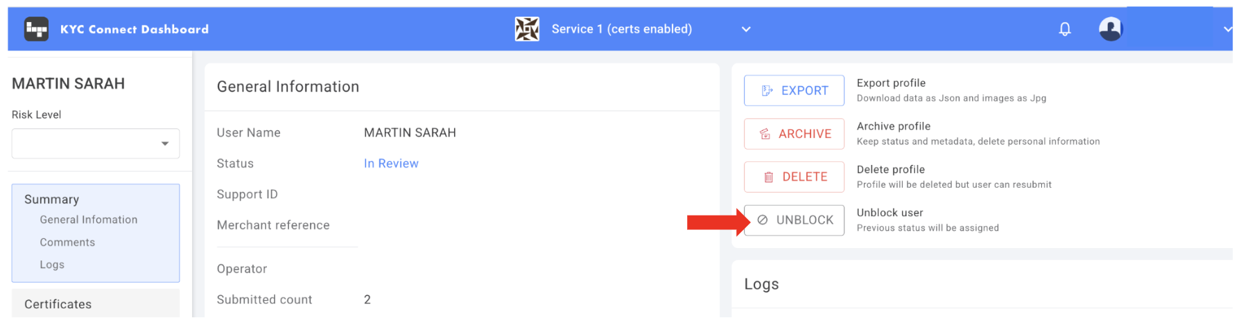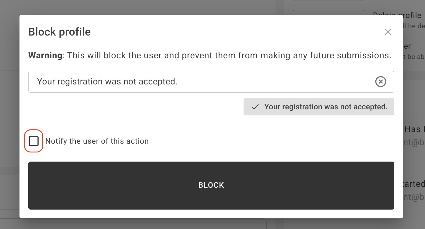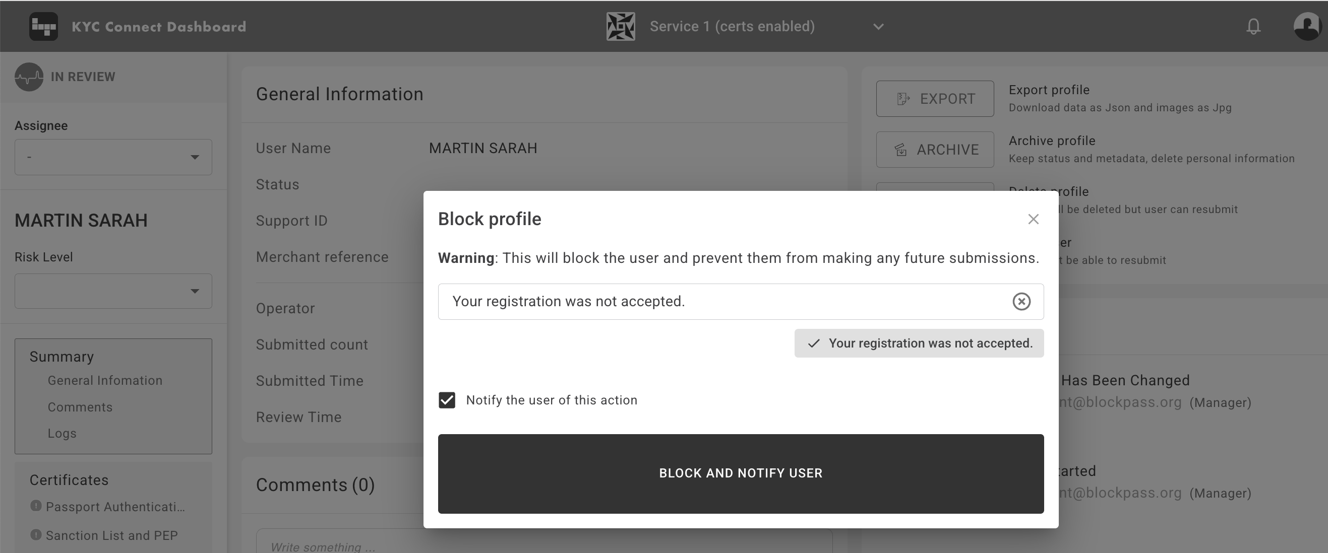 Block: In cases of suspected fraud (fake documents or mule accounts), an undetermined False Positive AML result, or a True Positive AML result, consider blocking the profile. Click "BLOCK" in the Summary tab, edit the message if you want, and click "BLOCK AND NOTIFY USER".