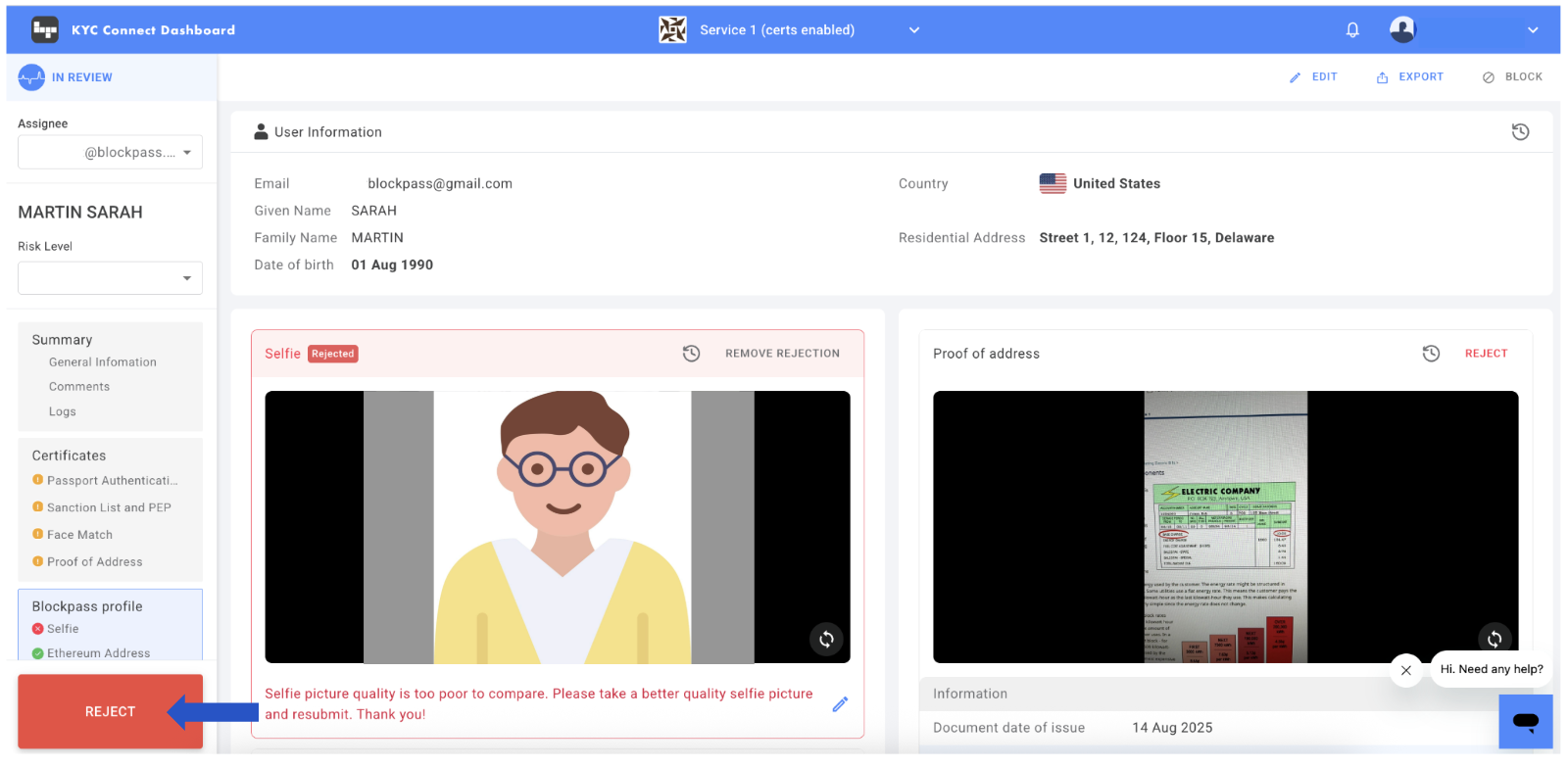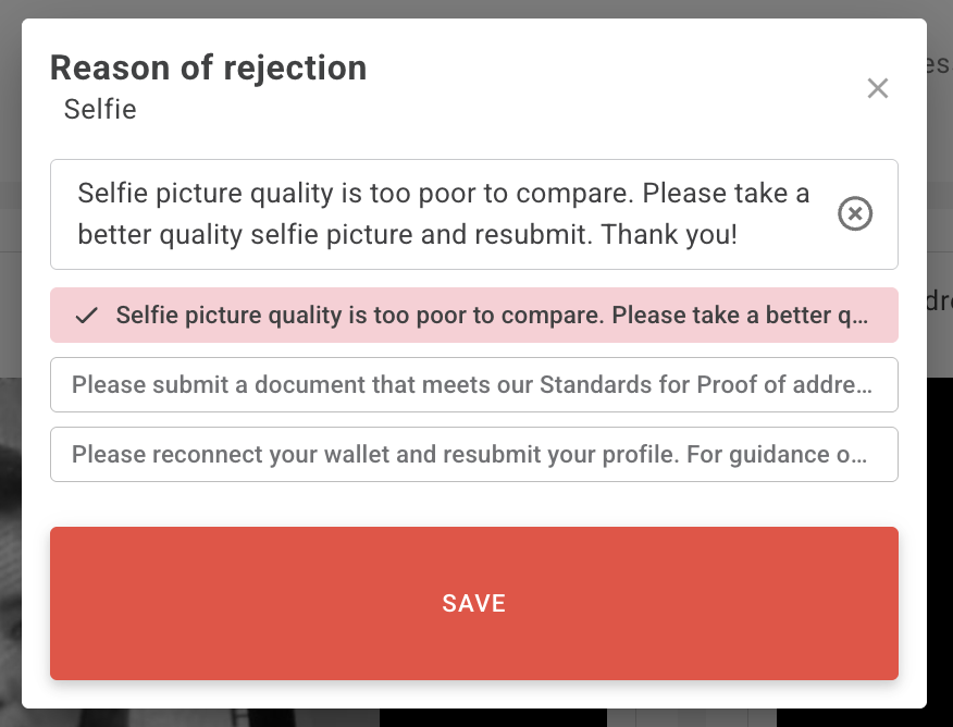 Reject: If attributes are invalid, click "REJECT" for the specific attribute(s) and provide a reason for rejection with action required from a user. You can choose a pre-defined reason or write your own.