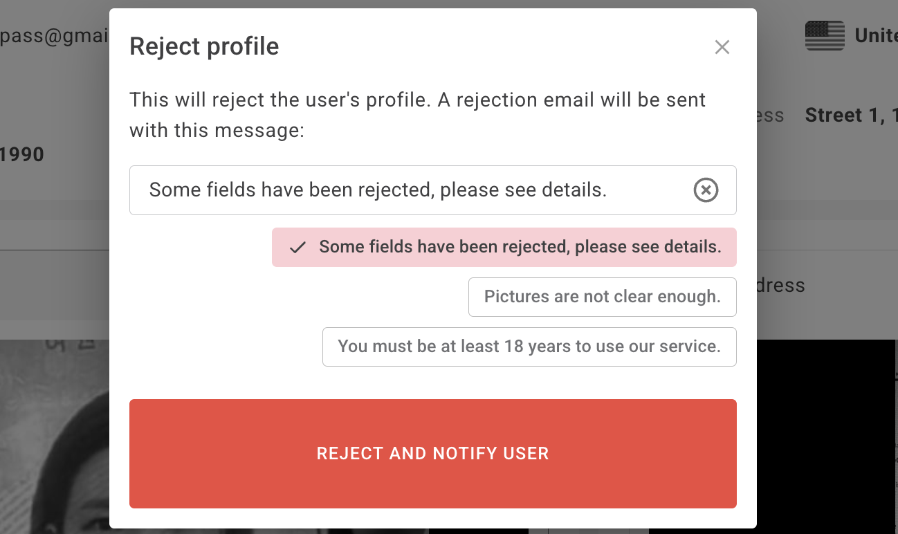 You may update the Rejection message for the profile if needed, then click “REJECT AND NOTIFY USER” to complete the process.