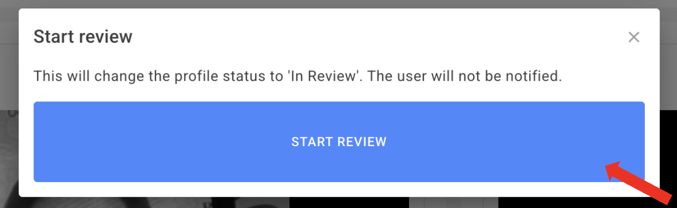 A pop-up will appear confirming that the profile status will change to 'In Review'. Click “START REVIEW” again to proceed.