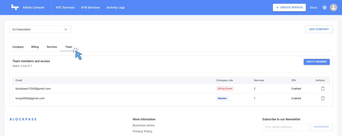 To start, log in to Blockpass Companies and navigate to the Team tab.