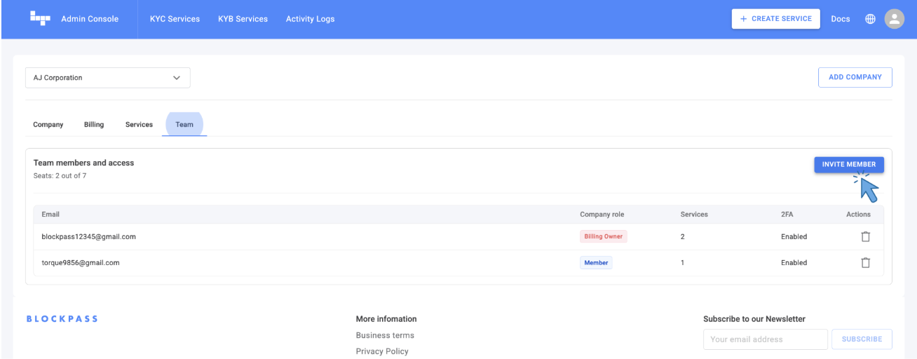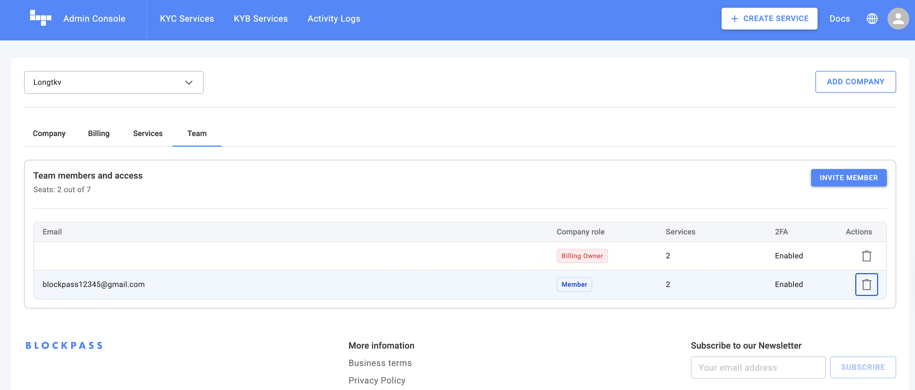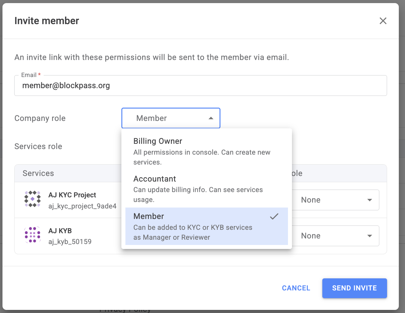 To Add: Click INVITE MEMBER, enter the email, and assign a Company Role. You can also assign roles for existing KYC/ KYB services simultaneously.