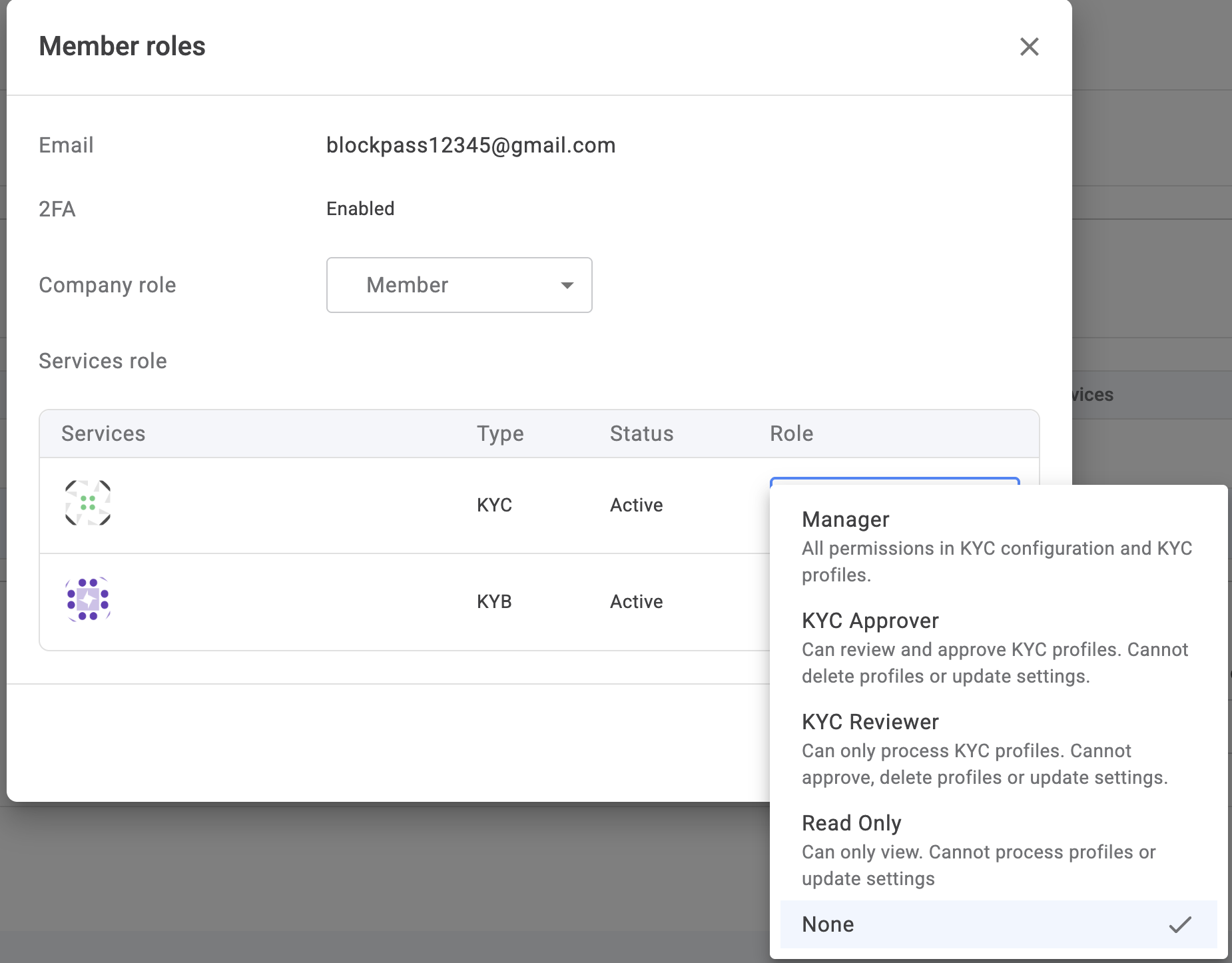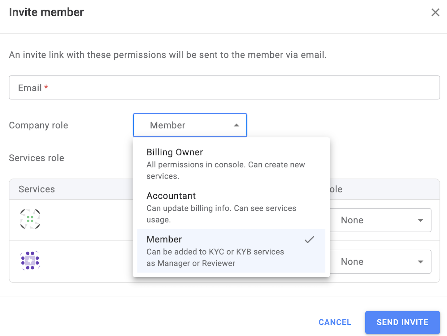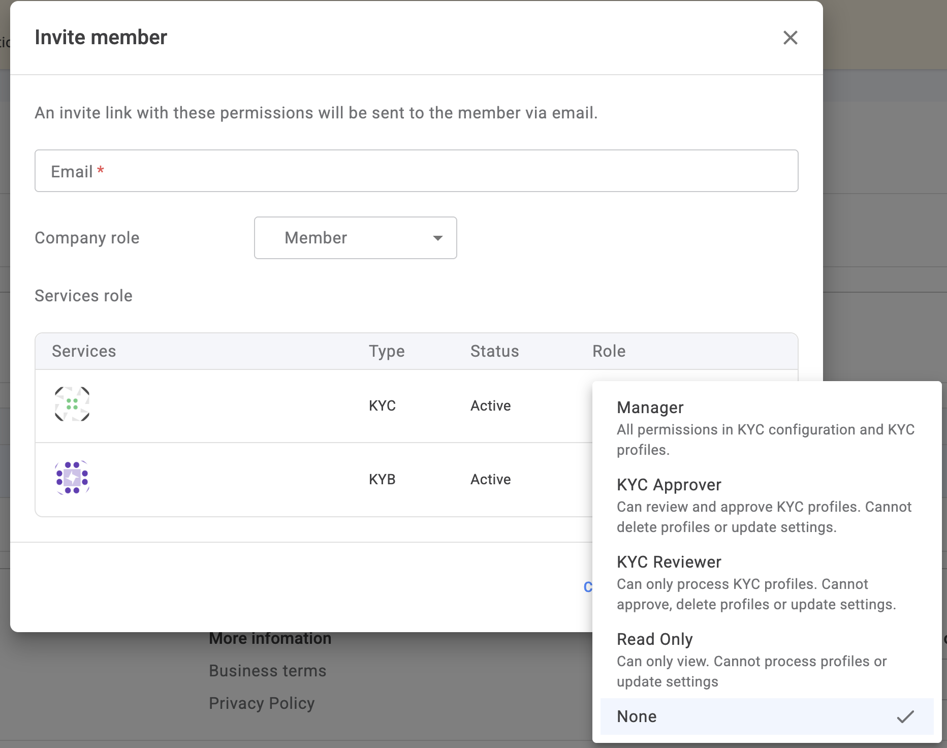 The "NONE" Option: If you want to add a member to the company account (e.g., for billing or general oversight) but do not want them accessing specific KYC/KYB data yet, select NONE for those services.
